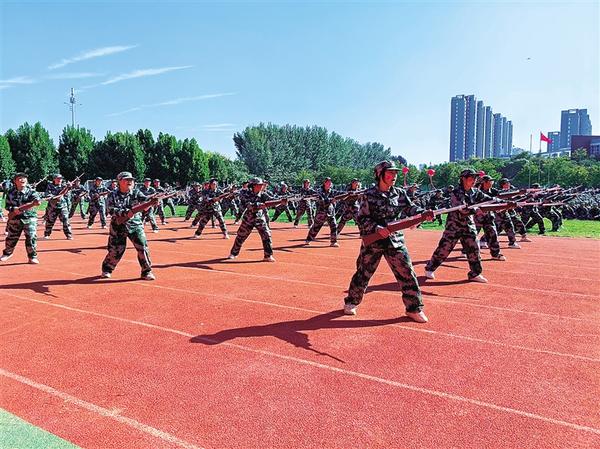 9月22日,周口职业技术学院学生在操场上进行军训。连日来,我市各高校军训火热进行中,走正步、拼刺刀、棍术格斗……各高校以军事训练为主,结合理论学习,旨在增强学生的国防观念,让新生上好大学“第一课”。 记者 刘华志 摄