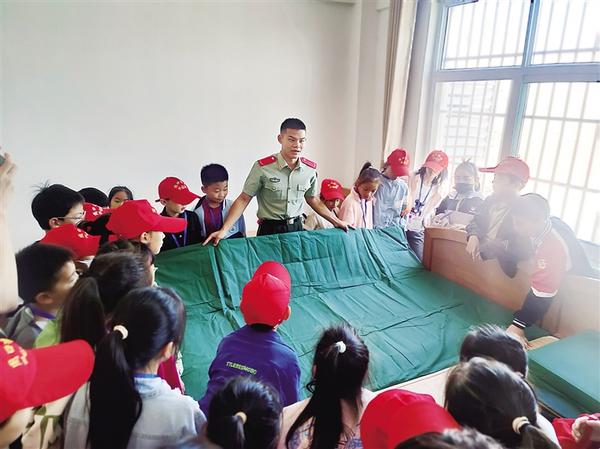“叔叔,这被子是怎么叠成的呀?太震撼了吧?”在机动中队班宿舍,武警官兵现场讲解内务整理流程和技巧。小记者经过练习,被子在他们手中逐渐有了棱角。