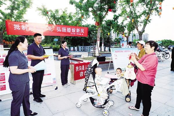 本报讯 为抵制高额彩礼、倡树婚嫁新风,推动社会主义核心价值观在家庭落地生根,近日,扶沟县人民法院组织干警到县城广场、各乡镇集市开展“抵制高额彩礼 弘扬婚嫁新风”主题宣传活动。