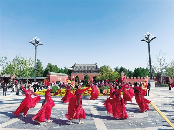10月2日,舞者在太昊伏羲陵景区午朝门前舞蹈。国庆假期期间,太昊伏羲陵文化旅游区以丰富多彩的国庆活动吸引了大量游客前来寻根谒祖、观光游览。太昊伏羲陵文化旅游区呈现出一派欢乐、祥和的景象。