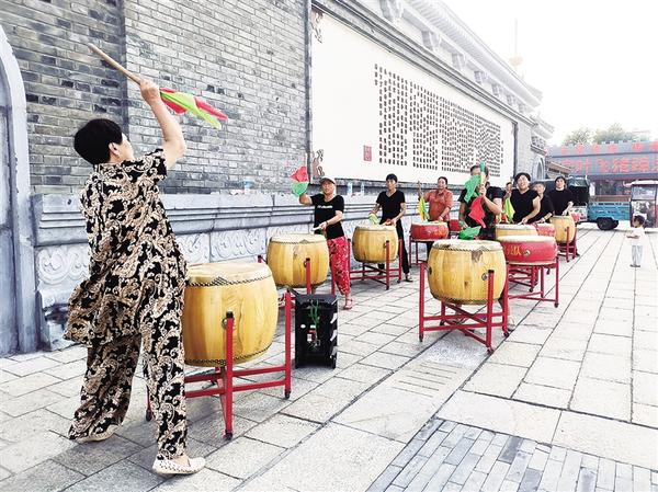 10月8日,村民在邓城镇叶氏庄园广场为即将到来的重阳节排练大鼓节目。据了解,升级改造后的叶氏庄园周边干净整洁,已成为村民和游客休闲娱乐的好去处。记者 沈湛 摄