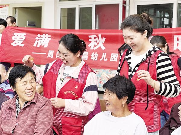 10月10日上午,周口市文昌幼儿园党支部30余名党员志愿者来到川汇区城南街道综合养老中心,开展“爱满金秋 情暖重阳”志愿服务活动。志愿者向老人送去慰问品,并表达对老年人的美好祝福。