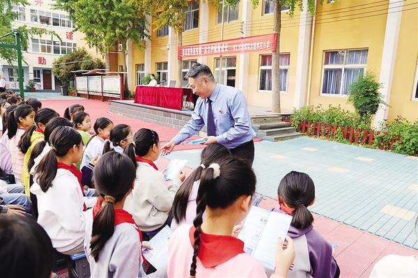 检察干警为学生发放普法宣传资料。为进一步增强学生的法治意识,促进学生身心健康全面发展,近日,川汇区人民检察院党组副书记、副检察长徐广宇带领该院第五检察部检察干警走进周口市李庄小学,以“塑造阳光心态”为主题,为该校学生上了一堂生动的法治教育课。通讯员 范闻鑫 摄