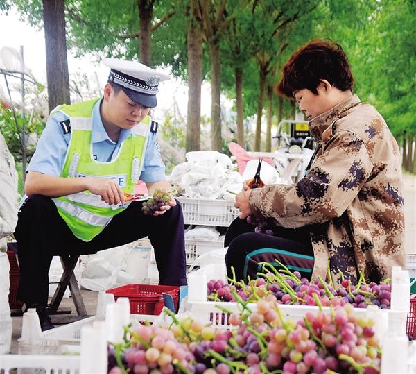 10月12日,民警帮助果农分拣、包装葡萄。连日来,周口市公安局高速警察支队三大队组织民警到高速沿线的川汇区城北街道邵火庙村田间地头助收,并向村民普及道路交通安全知识,全力以赴为秋收保驾护航。通讯员 郭利军 摄