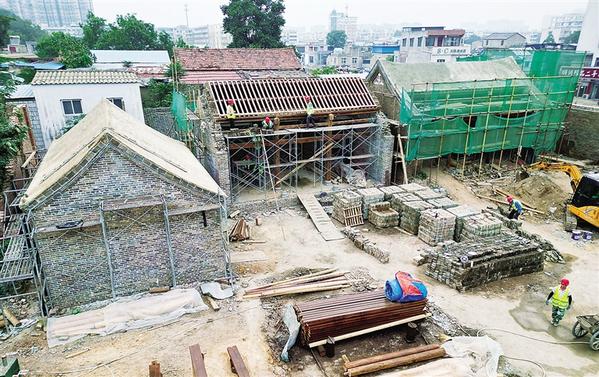 10月13日,工人正在复建的后殿上施工。据了解,此次主要修缮镇冲寺后进院建筑,并在原址(文昌大道与中州大道交叉口西北角)复建了后殿和西厢房。目前,镇冲寺主墙体及屋顶已经成型,预计年底完工。