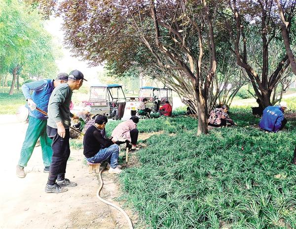 10月14日,周口公园管理方抓住晴好天气,组织人员对园区内绿植进行系统管理,对林下绿地补种了麦冬等常青植物,既美化了环境又有效防止了水土流失。记者 沈湛 摄