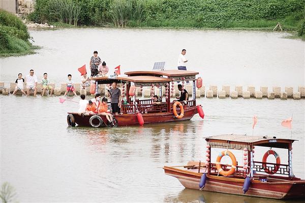沙颍河畔高门村,昔日废弃的坑塘已成为人们的水上乐园。