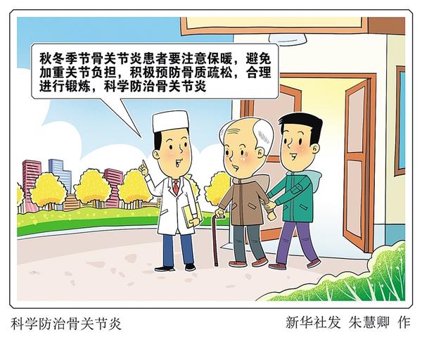 关节僵硬、肿痛、行动受限……很多骨关节炎患者都会有这样的症状。近年来,骨关节炎的发病率有所上升,骨科医生提醒,骨关节炎是一种多见于中老年人群的退行性疾病。秋冬季节,骨关节炎患者要注意保暖,避免加重关节负担,积极预防骨质疏松,合理进行锻炼,科学防治骨关节炎。 新华社发 朱慧卿 作