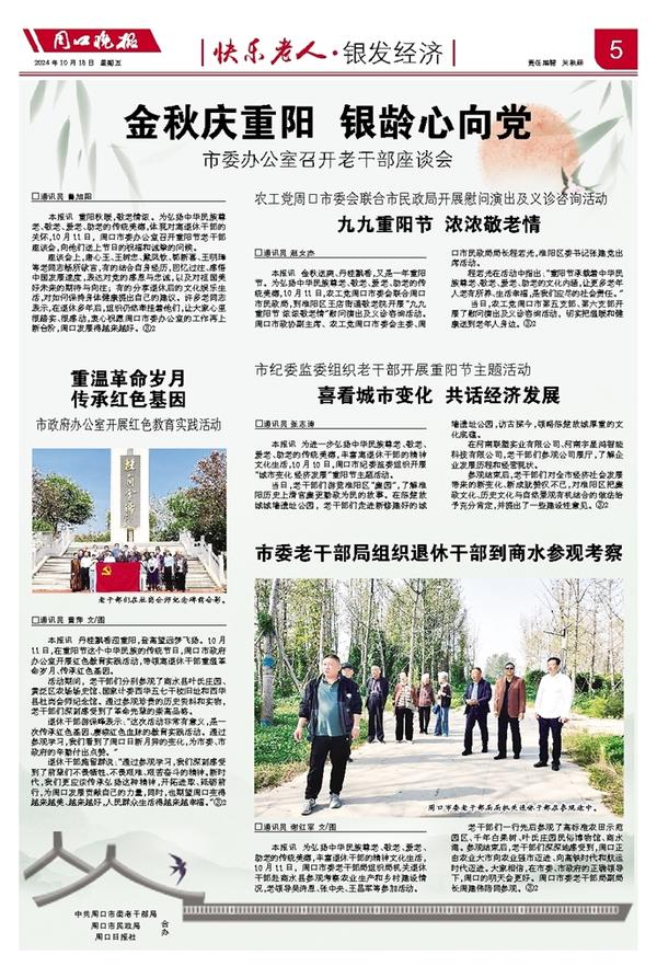 本报讯 为进一步弘扬中华民族尊老、敬老、爱老、助老的传统美德,丰富离退休干部的精神文化生活,10月10日,周口市纪委监委组织开展“城市变化 经济发展”重阳节主题活动。
