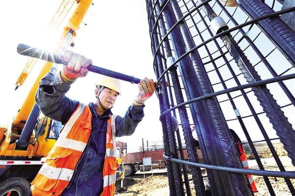 10月27日,工人在绑扎钢筋。连日来,工人们在周口港中心作业区进行打桩作业,为建设港口码头打好基础。据了解,位于商水县黄寨镇王潭村和小集村的周口港中心作业区未来将建设22个泊位,当前建设的一期工程将建设13个泊位。记者 梁照曾 摄