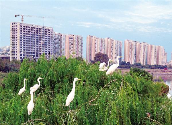 10月28日,一群白鹭栖息在中心城区沙颍河大庆路桥东侧的柳树上。近年来,我市牢牢树立“尊重自然、顺应自然、保护自然”的生态文明理念,加强生态环境保护治理,有效提升了生态环境质量。记者 沈湛 摄
