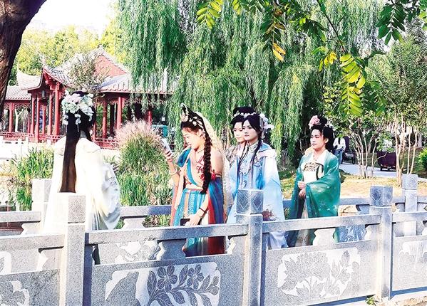 10月27日,几名身着汉服的姑娘游走在关帝庙历史街区三义公园里。整体提升后的关帝庙历史街区成了热爱传统文化青年们的聚集打卡地,他们三五成群、盛装出镜,体验传统文化的独特魅力。记者 沈湛 摄