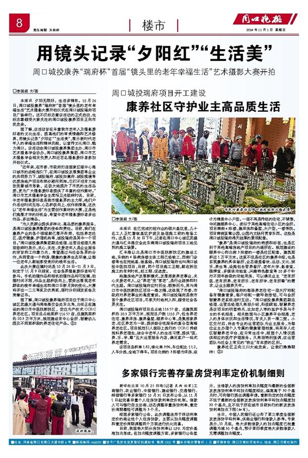 本报讯 夕阳无限好,生活多精彩。10月26日,周口城投康养“瑞府杯”首届“镜头里的老年幸福生活”艺术摄影大赛开拍仪式在周口城投瑞府项目广场举行。这不仅标志着该活动的正式启动,也标志着颇受大家关注的周口城投康养项目正向市民走来。