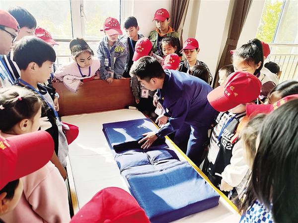 随后,小记者跟随消防员走进了他们的宿舍。看到消防员将被子叠得如同“豆腐块”般整齐,宿舍环境井然有序,小记者纷纷赞叹不已。消防员还现场演示了如何叠被子,激发了小记者动手尝试的热情。