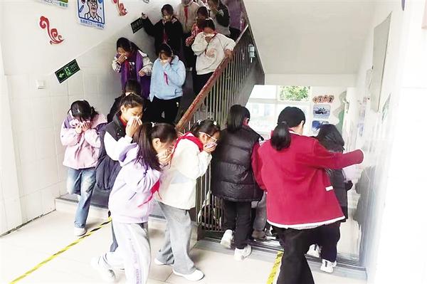 随着警报声响起,安全逃生演练开始。在教师的带领下,同学们用小毛巾捂住鼻子,沿着安全通道紧急撤离。从警报拉响到全体师生安全到达规定地方,只用了2分50秒。