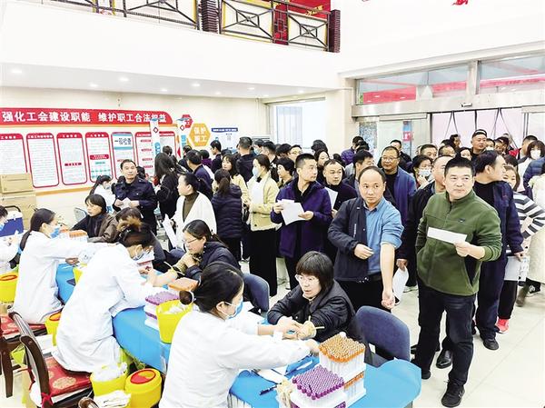 体检现场,职工们有序排队、登记信息、领取体检表,并逐一完成各项体检项目;医护人员认真询问体检人员有无重大疾病手术史、近期健康状况等问题,并针对具体问题提供合理化建议,帮助他们了解自身健康状况,提醒他们对疾病做到早预防、早发现、早治疗。