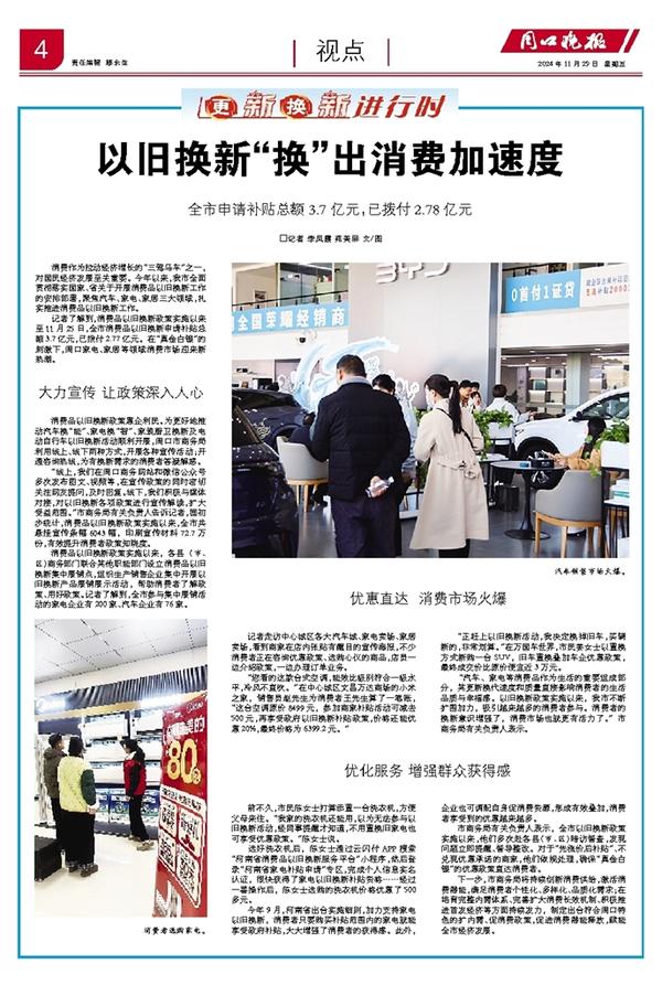 记者了解到,消费品以旧换新政策实施以来至11月25日,全市消费品以旧换新申请补贴总额3.7亿元,已拨付2.78亿元。在“真金白银”的刺激下,周口家电、家居等领域消费市场迎来新热潮。
