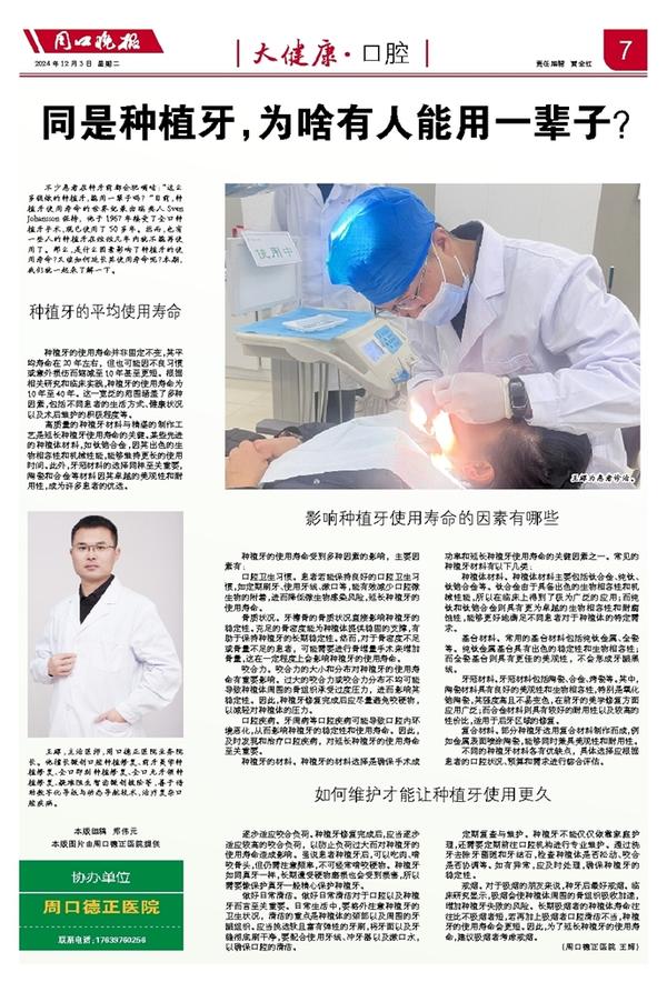 不少患者在种牙前都会犯嘀咕:“这么多钱做的种植牙,能用一辈子吗?”目前,种植牙使用寿命的世界纪录由瑞典人Sven Johansson保持,他于1967年接受了全口种植牙手术,现已使用了50多年。然而,也有一些人的种植牙在短短几年内就不能再使用了。那么,是什么因素影响了种植牙的使用寿命?又该如何延长其使用寿命呢?本期,我们就一起来了解一下。