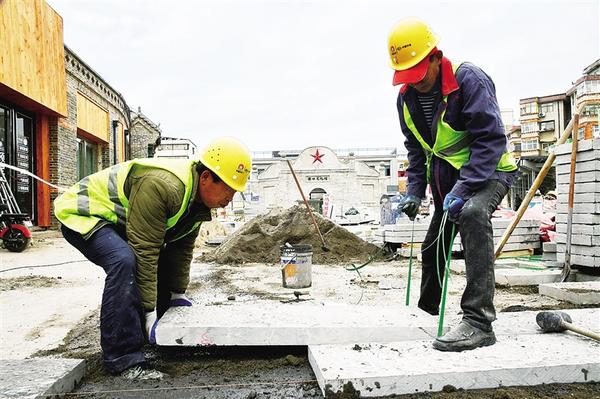 12月11日上午,工人在南寨历史文化街区剪股街铺设石板。据了解,剪股街铺设石板路面工程于9月份启动,目前即将完工。记者 梁照曾 摄