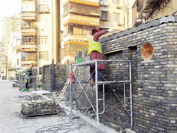 12月12日,川汇区南寨历史文化街区剪股街东街,施工人员正在积极修建文化墙。文化墙建筑风格与周边环境浑然一体,建成后将展现历史文化街区风貌。记者 沈湛 摄