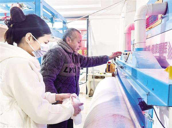 12月12日,鹿邑县穆店乡燕宋庄村民燕伟和女儿正在忙着缝制“龙被”。今年51岁的燕伟与妻子在无锡一家床上用品厂打工多年,11月份回到家乡创业就取得“开门红”,他们平均每天能缝制棉被100多条,供不应求。据了解,在豫东农村有龙年缝新被子的习俗。 记者 侯国防 通讯员 于新豪 摄