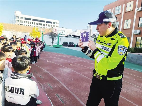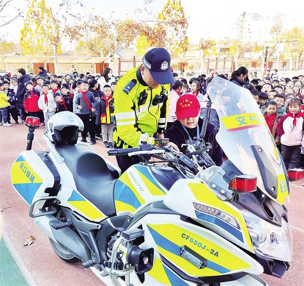 本报讯 12月16日,市公安局交通警察支队铁骑大队走进周口市建设路实验学校,开展交通安全知识教育活动。在展示警用装备环节,该校的周口报业小记者见到了打击违法犯罪的“神器”。
