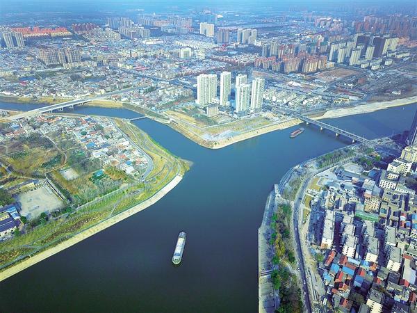昨日,两艘货船缓缓驶过贾鲁河与沙颍河交汇处。贾鲁河全长255.8公里,在川汇区注入沙颍河。两条内河在此交汇,周口必将成为我省内河航运的焦点。记者 沈湛 摄
