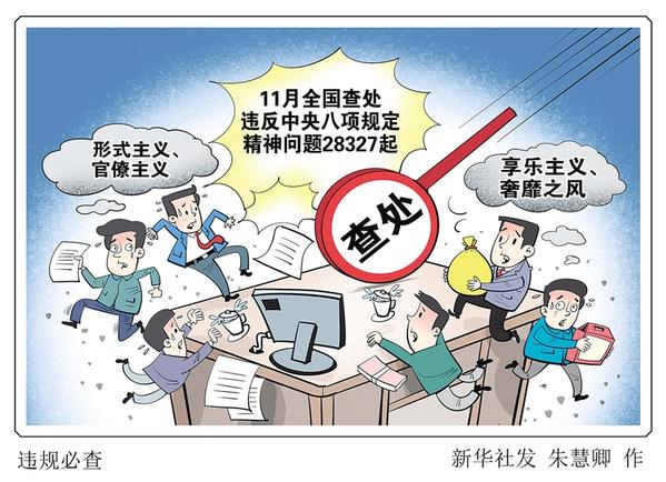 中央纪委国家监委网站12月25日公布全国查处违反中央八项规定精神问题情况月报数据。通报显示,今年11月,全国共查处违反中央八项规定精神问题28327起,批评教育和处理38961人(包括2名省部级干部、98名地厅级干部),给予党纪政务处分27996人。新华社发 朱慧卿 作
