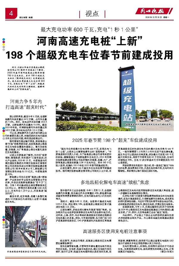 昨日,记者从河南中原高速公路股份有限公司(简称中原高速)了解到,2025年春节前河南高速公路将新增792个充电车位,其中198个超级充电车位(简称超充车位)也将建成投用。超充车位单桩最大充电功率600千瓦,实现充电“1秒1公里”,新能源汽车的充电时间将大幅缩短,缓解新能源车主的“里程焦虑”。