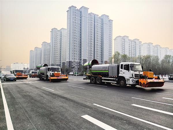 演练现场,工作人员迅速且精准地对各类机械设备进行安装调试,确保设备处于最佳作业状态。随着调度指令下达,撒布机在行车道进行融雪剂撒布作业,雪铲车、滚雪车紧随其后,高效模拟快速清理路面积雪作业流程。在机械作业完成后,针对部分特殊道路残留的积雪,环卫工作人员迅速行动,有序开展人工“扫雪除冰”作业。最后,环卫公司全力投入雪后环境卫生恢复工作,使城市道路迅速恢复整洁。