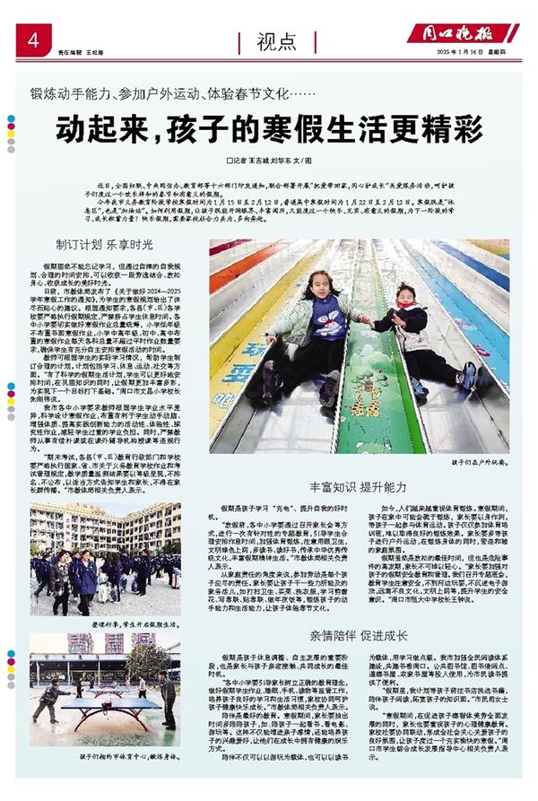 “寒假期间,在促进孩子德智体美劳全面发展的同时,家长也要重视孩子的心理健康教育。家校社要协同联动,形成全社会关心关爱孩子的良好氛围,让孩子度过一个充实愉快的寒假。”周口市学生综合成长发展指导中心相关负责人表示。