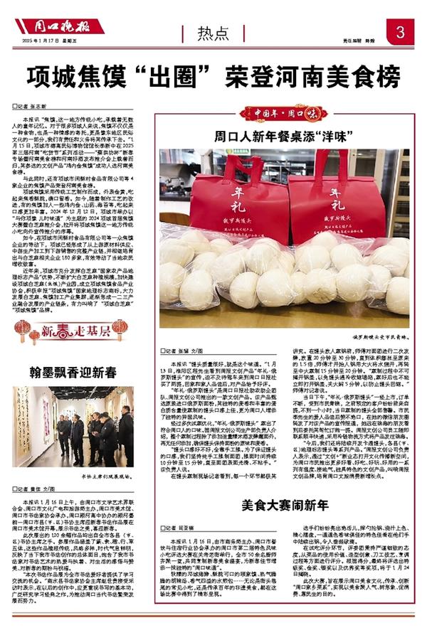 本报讯 “焦馍,这一地方传统小吃,承载着无数人的童年记忆。对于很多项城人来说,焦馍不仅仅是一种食物,也是一种情感的寄托,更是豫东地区民俗文化的一部分,我们有责任和义务将其传承下去。”1月15日,项城市德高民俗博物馆馆长李新中在2025第三届河南“吃货节”系列活动——“蔡洪坊杯”新春专场暨河南美食榜和河南好酒发布推介会上载誉而归,其参选的文创产品“鸡内金焦馍”成功入选河南美食榜。