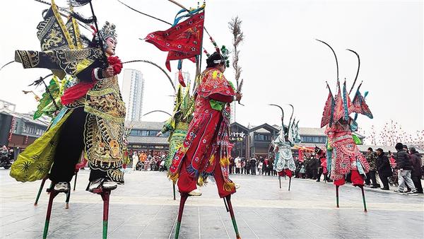 当天,关帝庙文化广场喝彩声、欢笑声、锣鼓声不断,国家级非物质文化遗产代表性项目沈丘文狮舞、项城官会响锣等节目让人大饱眼福。舞龙、扭秧歌、骑毛驴、划旱船等本土特色民俗节目轮番上演,演员们身穿喜庆服装,精神焕发、笑容满面。腰鼓、盘鼓表演气势磅礴,欢快的旋律和动感的节奏令人热血沸腾;秧歌队伍的演员舞动彩绸,脚步灵动,脸上满是笑容;高跷表演队演员技艺娴熟,做出各种惊险又有趣的动作,引得观众连连喝彩;伴随着激昂的锣鼓声,两只威风凛凛的醒狮奔腾而出,它们跳跃、眨眼,时而威武勇猛、气宇轩昂,时而活泼灵动、俏皮可爱;巨龙在演员们的操控下,跟着鼓点,穿、腾、跃、翻、滚、戏、缠,蜿蜒盘旋,仿佛要一飞冲天……