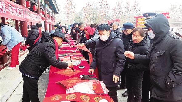 与此同时,义写春联的桌子也被市民围得水泄不通。书法家们挥毫泼墨,一副副饱含深情与祝福的春联一气呵成。围观的市民有的在一旁认真观摩,有的则与书法家交流,希望能得到“定制”的春联。一位大爷拿着刚写好的春联,笑得合不拢嘴:“这春联写得好,比买的春联有意义!”