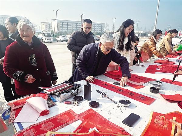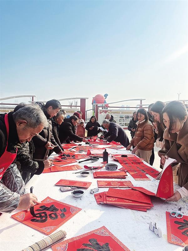 活动现场人潮涌动、热闹非凡。书法家们现场挥毫泼墨,将精美春联、喜庆“福”字送到群众手中。