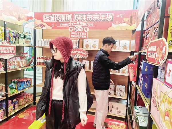 年货超市就设置在周口城投揽境营销中心的客户洽谈区,门头“逛城投揽境,抢胖东来年货”字样十分醒目。货架上DL胖东来商品主要有啤酒、厨房湿巾、矿泉水、水果燕麦脆、果蔬汁、油、洗洁精等十余个品种。为丰富商品种类,满足市民置办年货的多样化需求,超市还精心准备了金典纯牛奶、邦杰大块肉、东北大米等几十种商品。