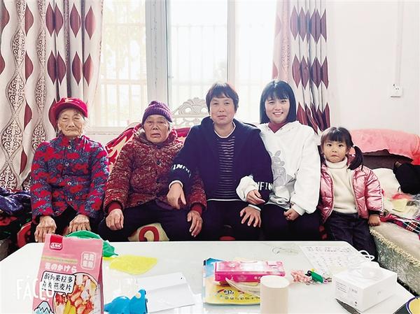 1月23日上午,冷空气再次“入侵”豫东平原,北风凛冽,雨水冰冷,西华县叶埠口乡赵寨村张坤立家中却暖意融融,堂屋里106岁老人刘关荣被她的外孙、外孙媳妇们围坐在中间,陪她拉家常。刘关荣的小外孙张建立今年48岁了,还时不时地在她面前故作孩子状,逗她开心。“我在她面前永远是小孩儿。”张建立说。