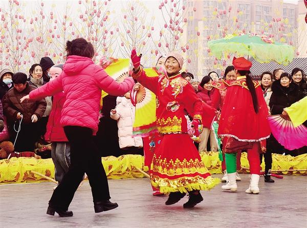 1月30日下午,一名市民兴奋地加入到扭秧歌队伍中。当天,关帝庙景区民俗节目表演精彩纷呈,人们在逛春会、赏民俗中开心过大年。记者 梁照曾 摄