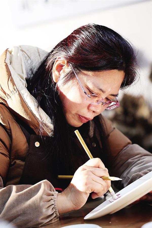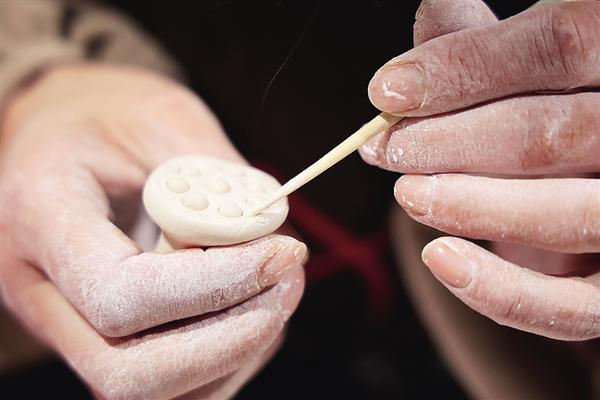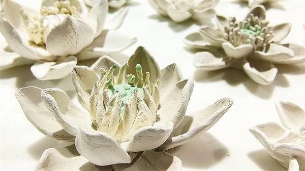 春节前后,创作研究中心为试烧第一批产品而一直忙碌着。拉花、组花工序台前,陈玉环带领画荷村的几名画师精心捏塑荷花造型,这是一道考验美感的精细工艺,非有一定艺术造诣者不能胜任,在画荷村飞快成长的画师刚好能派上用场。