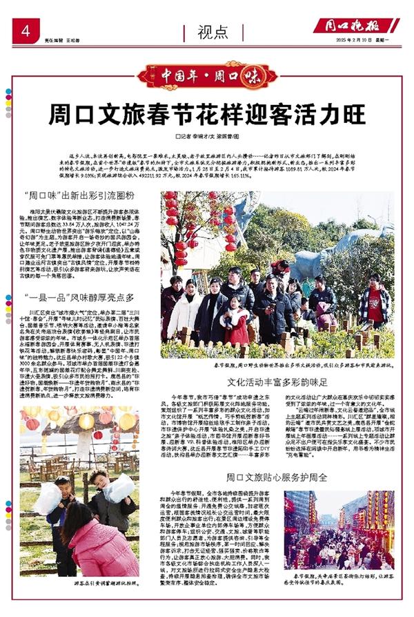 淮阳太昊伏羲陵文化旅游区不断提升游客参观体验,推出演艺、数字体验等新业态,打造消费新场景,春节期间游客总数达33.84万人次,旅游收入1047.24万元。周口野生动物世界突出“游乐嗨欢”定位,以“山海奇幻游”为主题,为游客开启一场奇妙的国风游园会,让年味更足。老子故里旅游区除夕夜开门迎宾,举办特色非物质文化遗产展,推出游客背诵《道德经》五章或穿汉服可免门票等惠民举措,让游客体验地道年味。周口建业运河古镇突出“古镇风情”定位,开展春节档特别演艺等活动,吸引众多游客前来游玩,让欢声笑语在古镇的每一个角落回荡。
