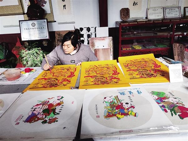 2月10日,周家口木版年画传承基地工作人员为木版年画着色。连日来,不少市民走进周家口木版年画传承基地,感受传统年味儿。据了解,周家口木版年画起源于明末清初,兴盛于清中晚期,寄托着人们对平安、健康、幸福生活的期盼,2015年被列为省级非物质文化遗产。记者 王吉城 摄