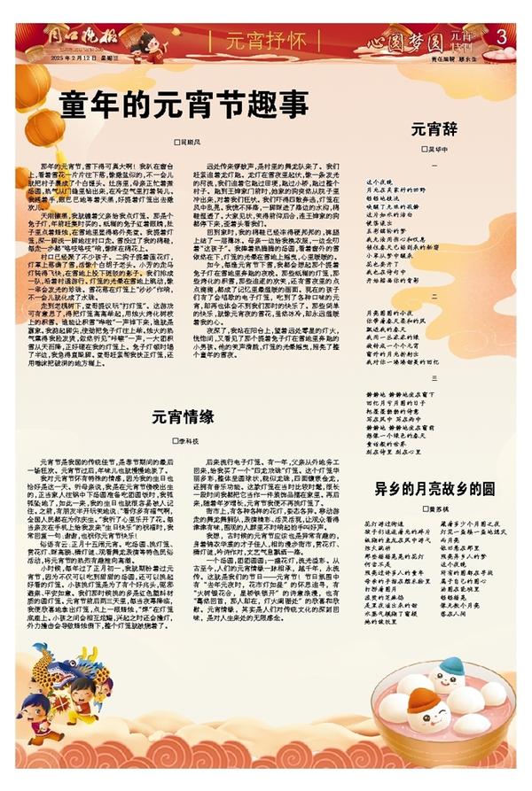 我对元宵节怀有特殊的情感,因为我的生日也恰好是这一天。听母亲说,我是在元宵节傍晚出生的,正当家人往锅中下汤圆准备吃团圆饭时,我呱呱坠地了,如此一来,我的生日也就很容易被人记住。之前,有朋友半开玩笑地说:“看你多有福气啊,全国人民都在为你庆生。”我听了心里乐开了花。每当亲友在手机上给我发来“生日快乐”的祝福时,我常回复一句:谢谢,也祝你元宵节快乐!