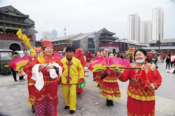 2月11日,10多名民间艺人表演《抬花轿》。今年春节期间,周口“三川十馆·春会”关帝庙片区热闹非常,红彤彤的灯笼、不同风格的民俗表演、来自各地的特色美食,吸引了大批市民前来游玩,带火了区域经济。记者 付永奇 摄