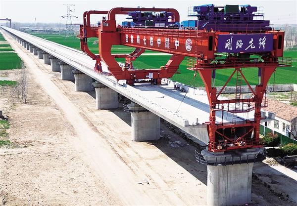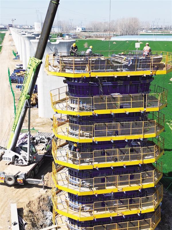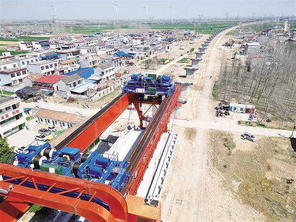 3月17日上午,中铁七局的工人正在紧张施工。目前,平漯周高铁项目快速推进,周口境内商周特大桥跨河流、国道、高速等连续梁施工进入加班加点抢工期阶段,桩基、承台、墩身施工接近尾声,已铺架箱梁90榀。记者 梁照曾 摄