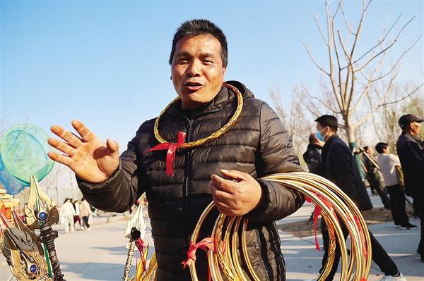 3月20日,淮阳街头一商贩向路人兜售乾坤圈。电影《哪吒之魔童闹海》的火爆热映带动了周边产品的热销。记者 刘俊涛 摄