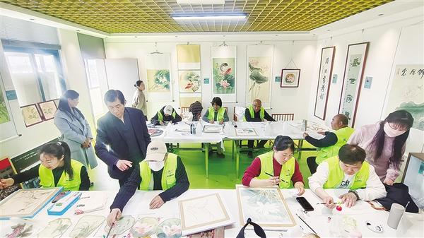 近日,淮阳区王店街道王楼村村民在美术老师的指导下画荷花。作为远近闻名的“画荷村”,王楼村一直延续着画荷花的传统。农闲时,村民经常在老师的指导下学习绘画技巧,将乡村生活的恬静与荷花的灵动融入笔墨之间。 记者 刘俊涛 摄