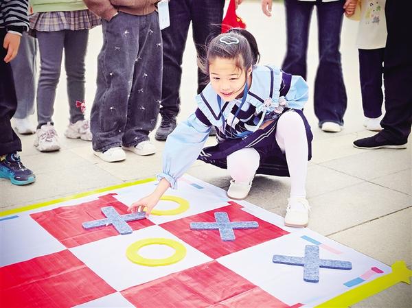 活动设置了“争分夺秒”“一圈到底”“三子棋”“东西南北跑”“运送军粮”等多个趣味挑战环节。在“东西南北跑”环节,小记者和家长齐心协力,奋力往前走,小朋友的加油声此起彼伏;“一圈到底”环节,大家手牵手,巧妙传递呼啦圈,充分展现了团队协作精神;“三子棋”挑战环节,小记者和家长则开动脑筋、规划策略,力求获胜。