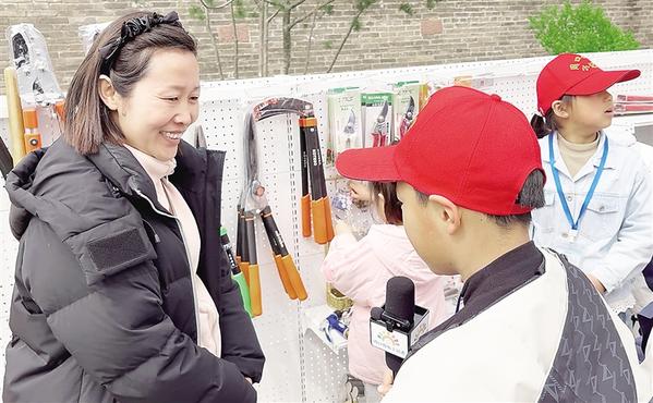 小记者采访花卉老板,学习养花工具的使用方法。