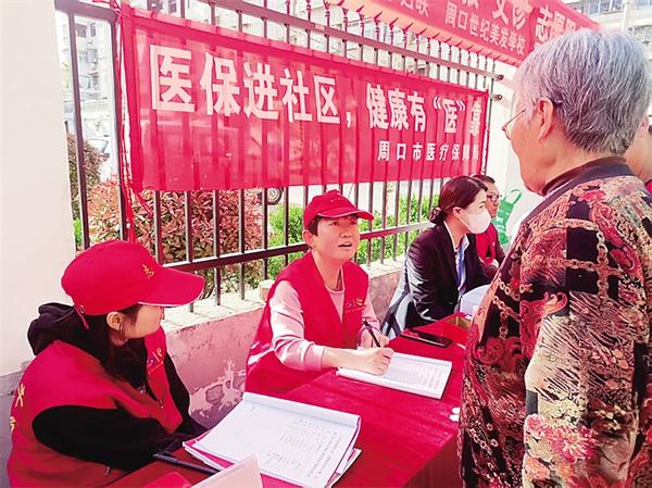4月2日,志愿者向市民宣讲医保政策。当日,市医疗保障局联合市文明办、市妇联、市大铁牛巾帼志愿者联合会以及多家爱心单位的志愿者,到川汇区陈州街回族街道牛营社区开展志愿服务活动。志愿者将政策解读、业务办理等服务送到市民“家门口”,以实际行动践行为民服务的誓言。记者 邱一帆 摄