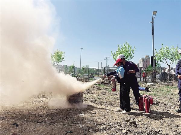 曙光救援队队员为小记者讲解灭火器的使用方法。